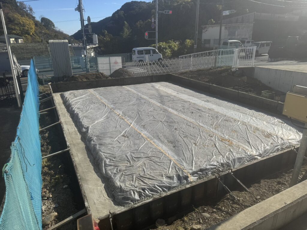 外周部に生コンを打設します。この時スラブ部分は必ず防湿シートで覆います。