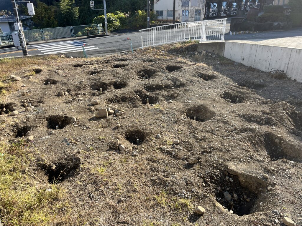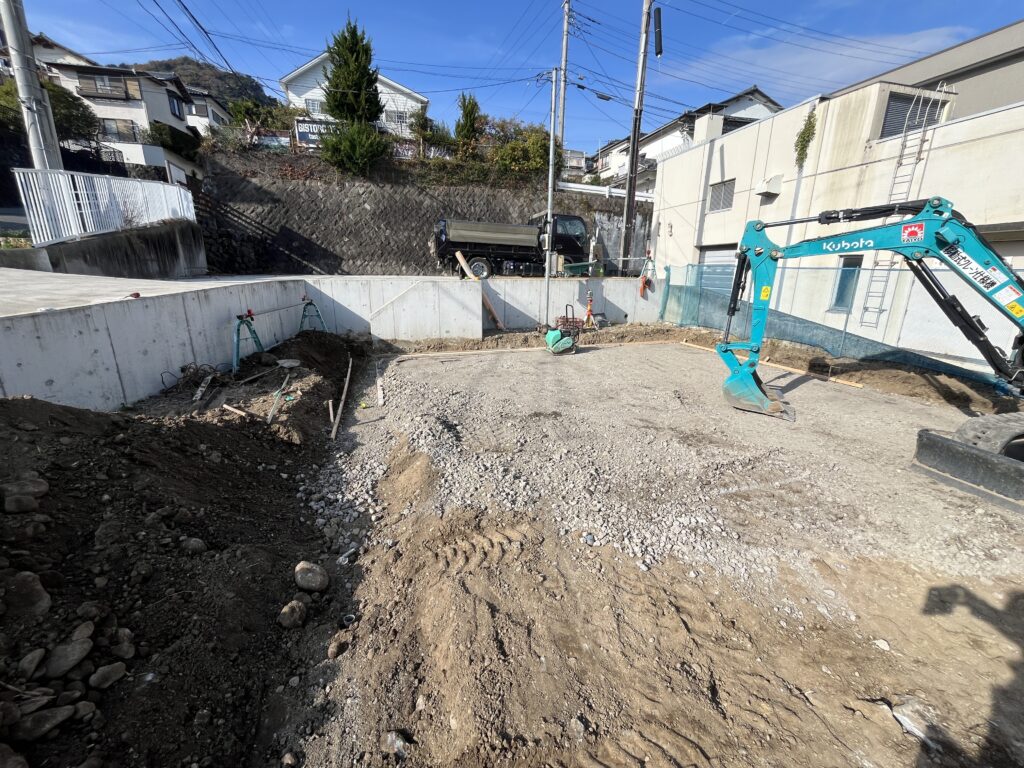 改良工事後、杭天端が捨てコン、スラブコン天端になるように床掘、砕石で形を作っていきます!